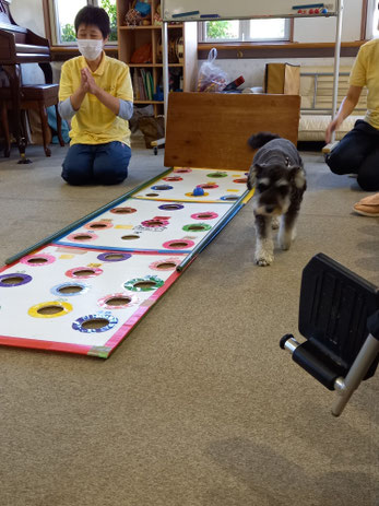 またセラピー犬が必ずマスターしておきたい事の一つ、「名前を呼ばれたらその人の所へ行く」というお勉強。