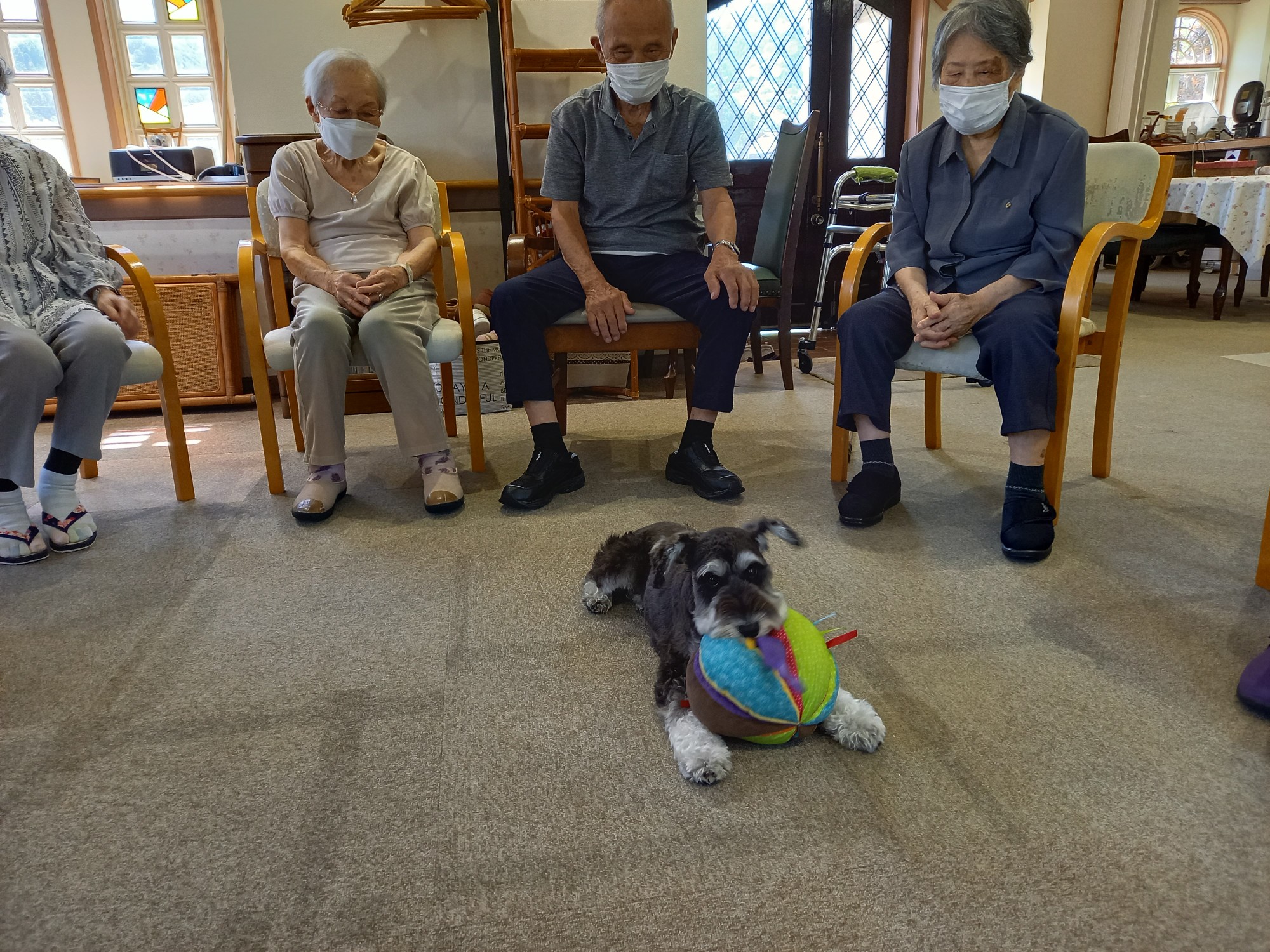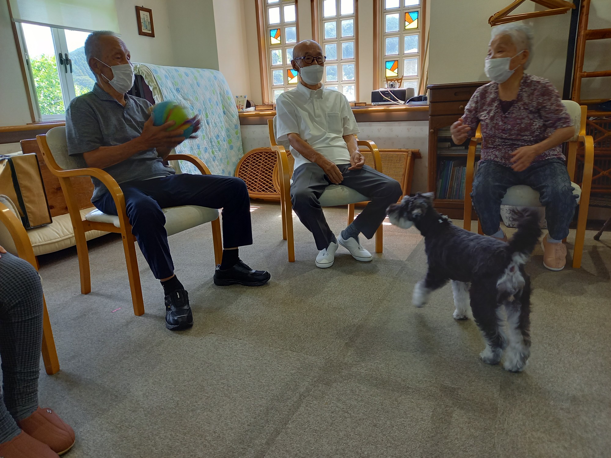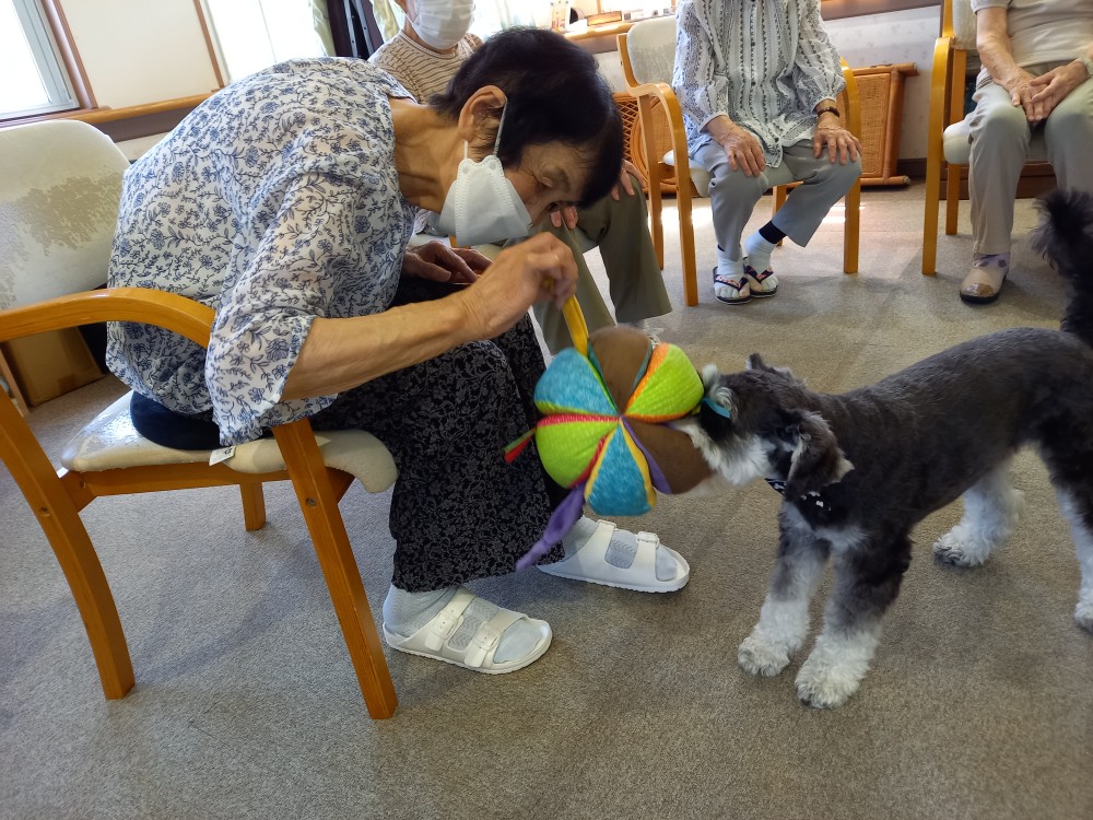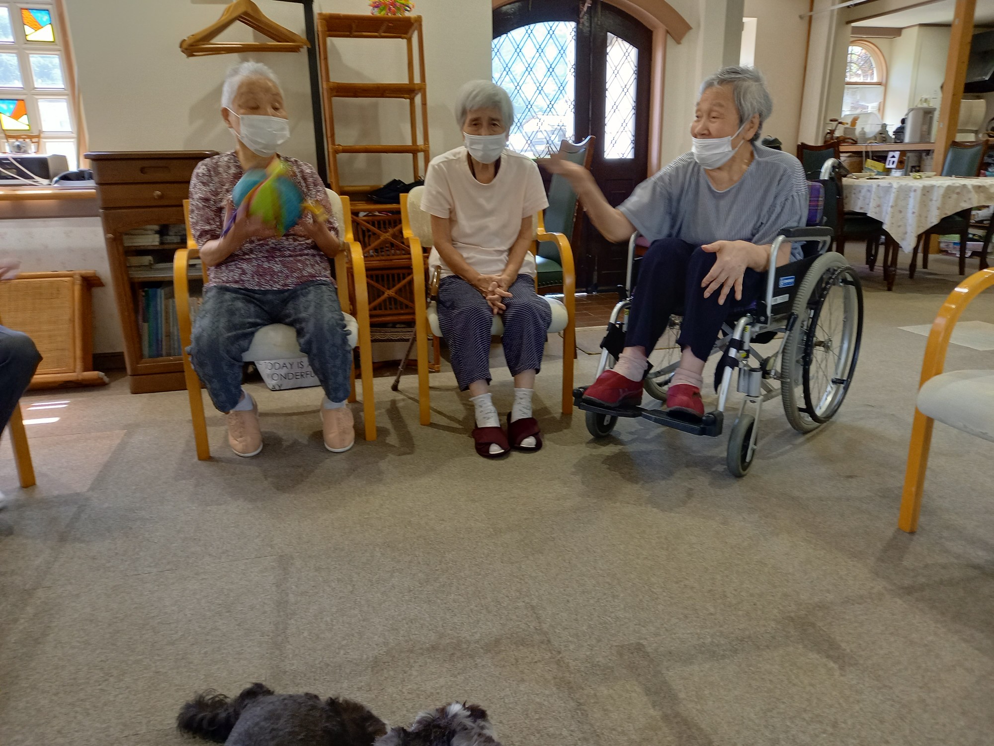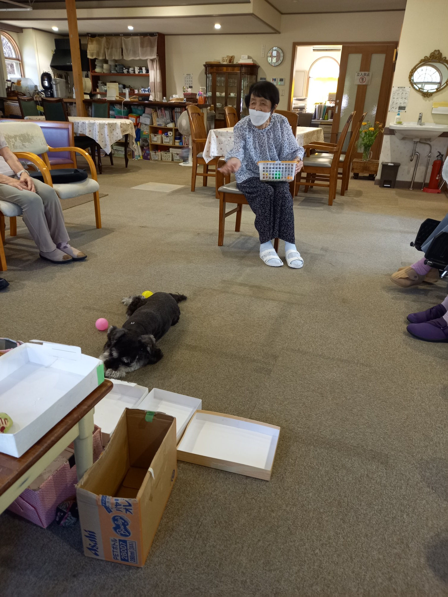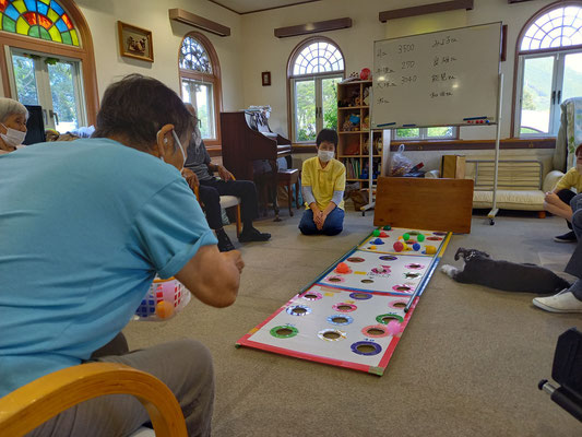 ご利用者さんは円陣に座って頂き、バムにボールを取られないようにパスします。