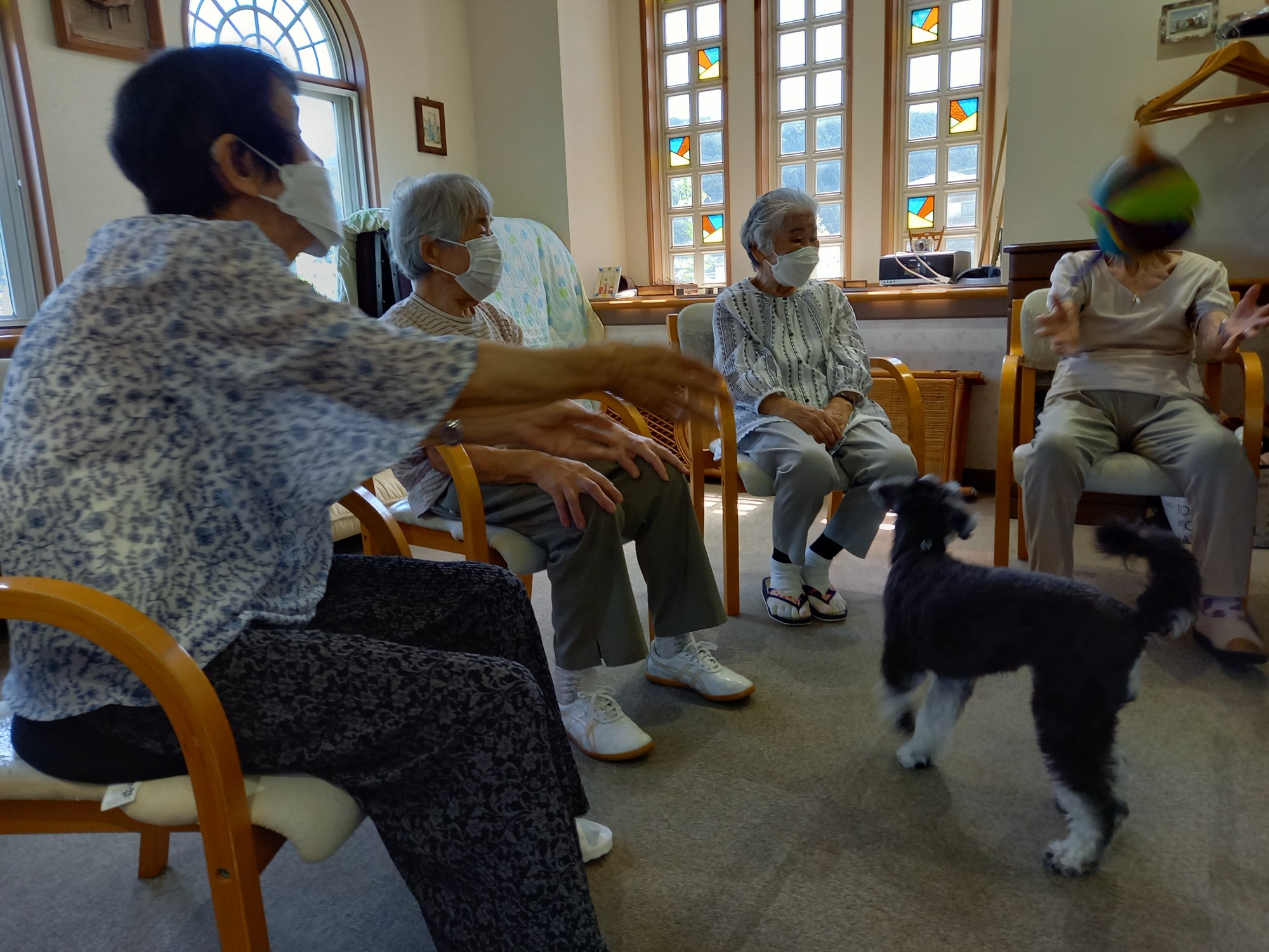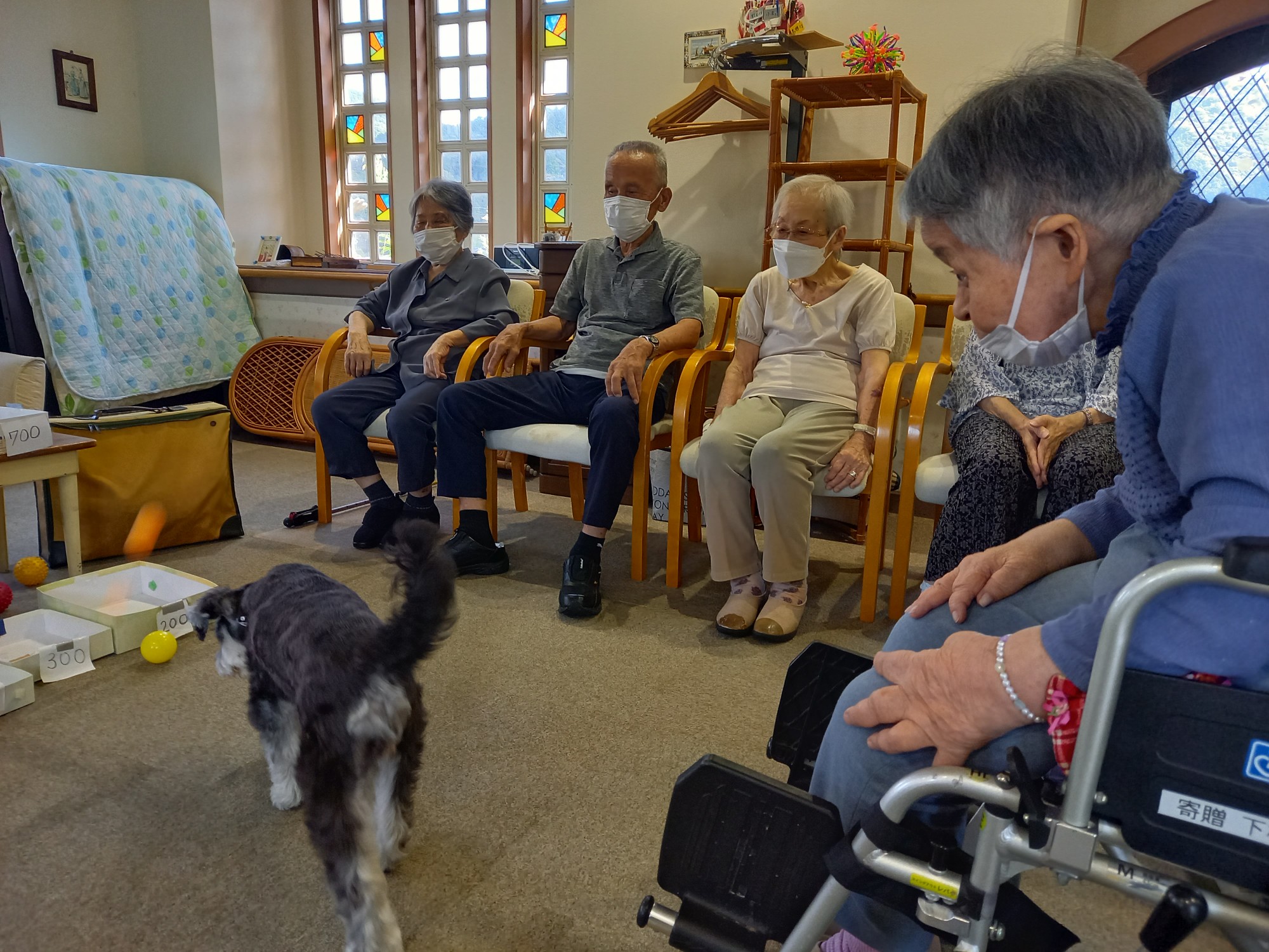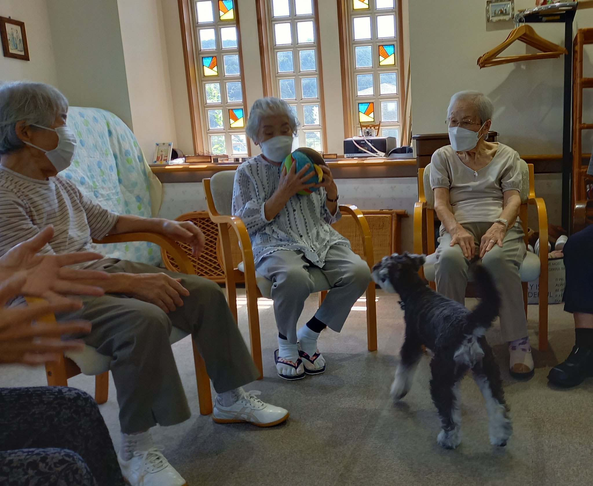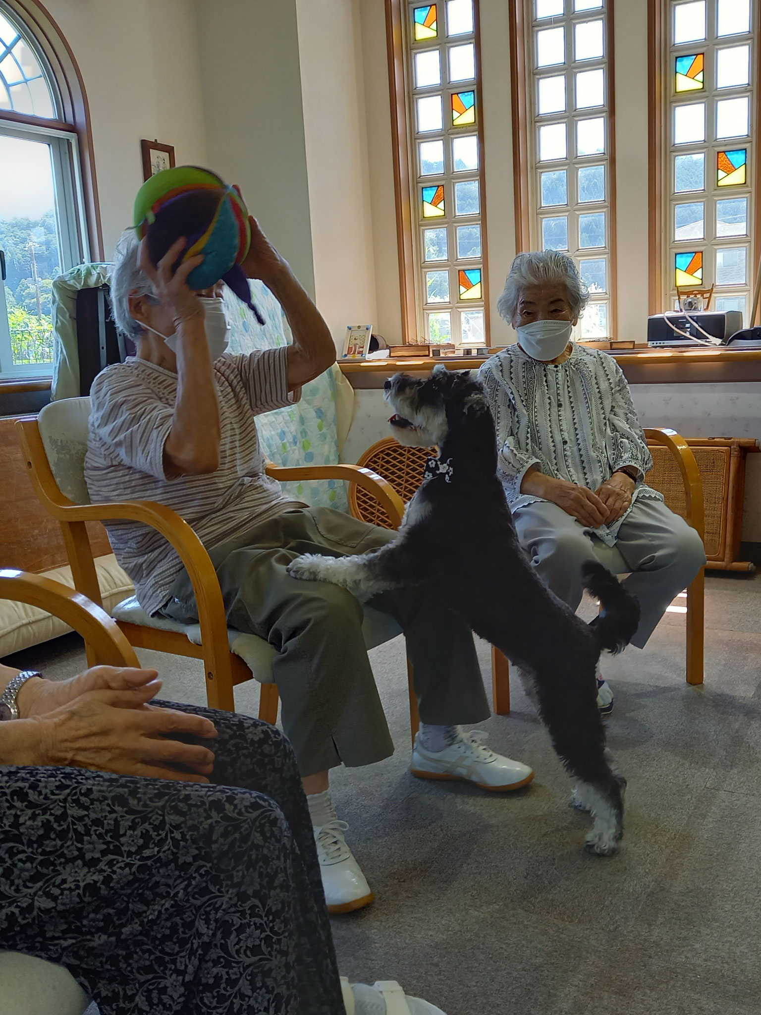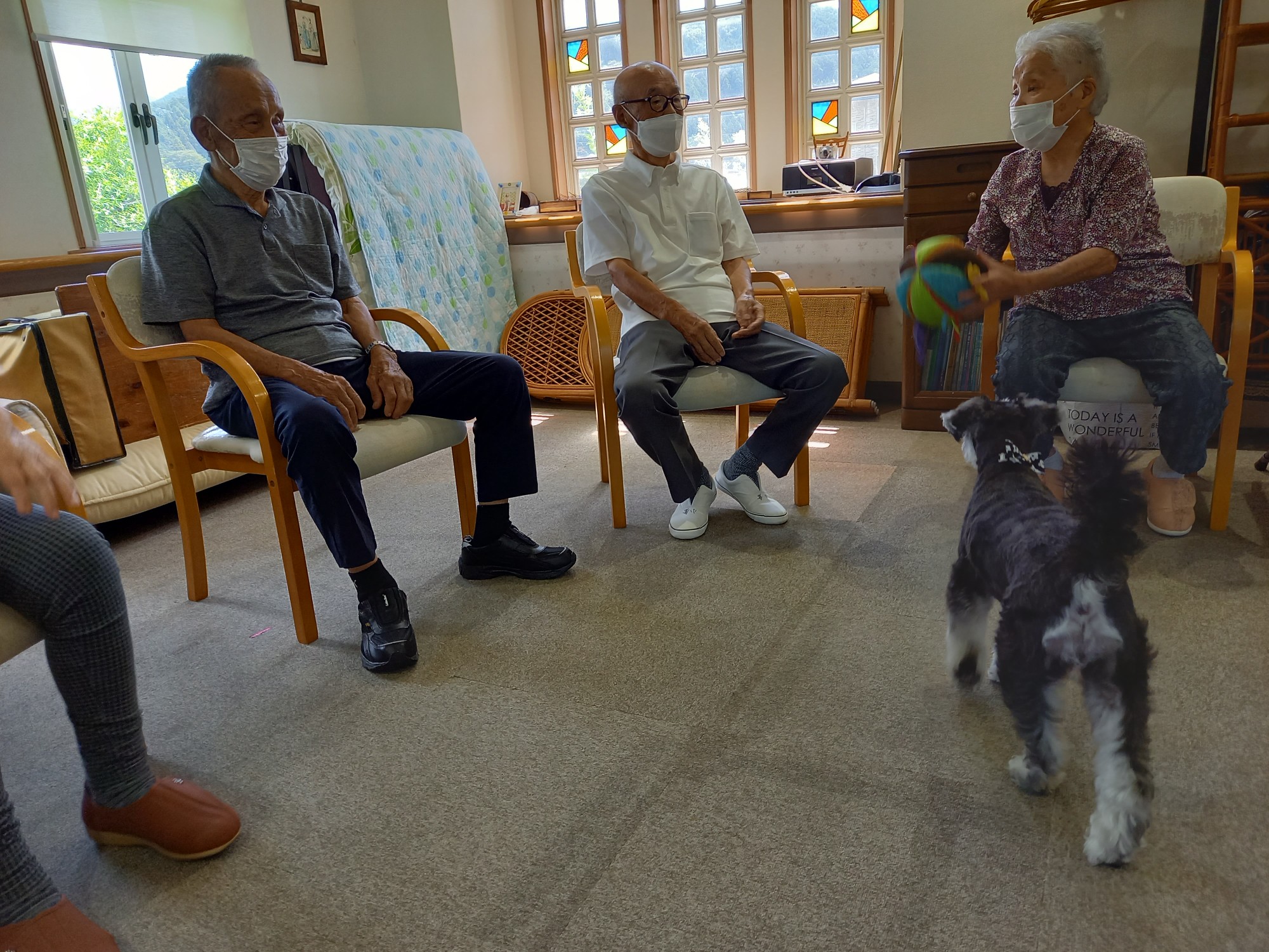ご利用者さんは円陣に座って頂き、バムにボールを取られないようにパスします。