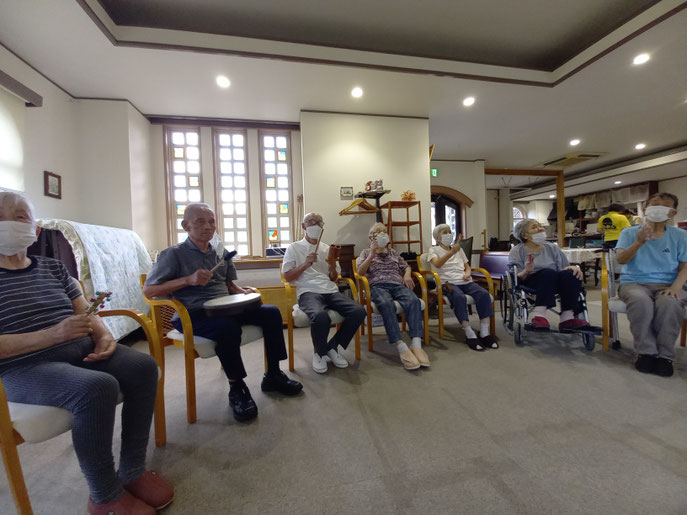 こんな遊びをしてもらって、この後は音楽療法となりますが、バムはハウスに入っている時と、皆さんの演奏を床で聞いて振動をお腹で感じている時と、両方あります。