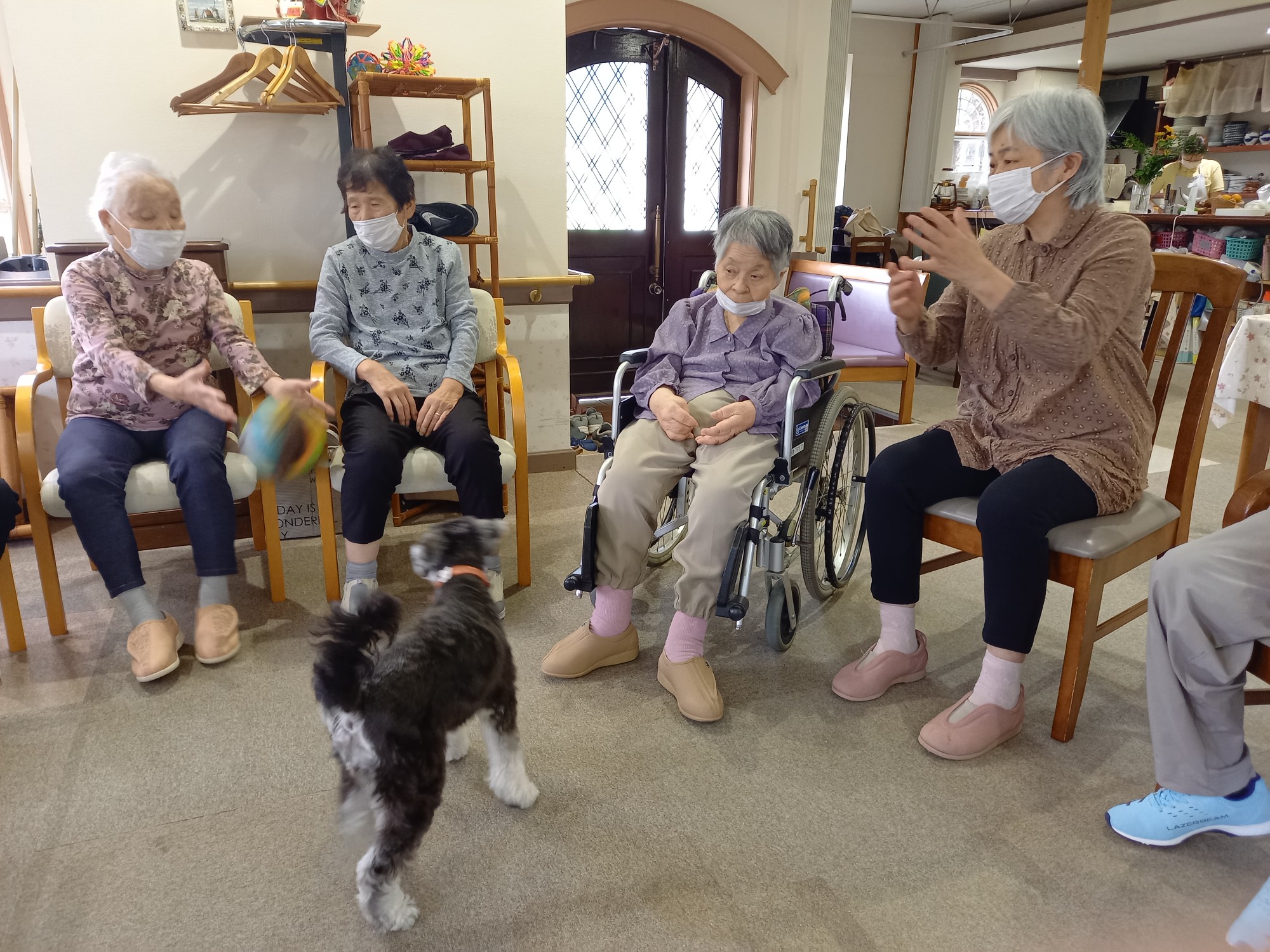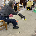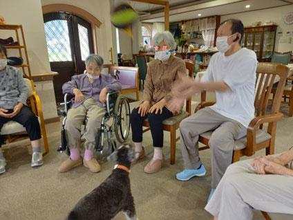 次はバムにボールを取られないように、ご利用者さんたちでボールパスです。