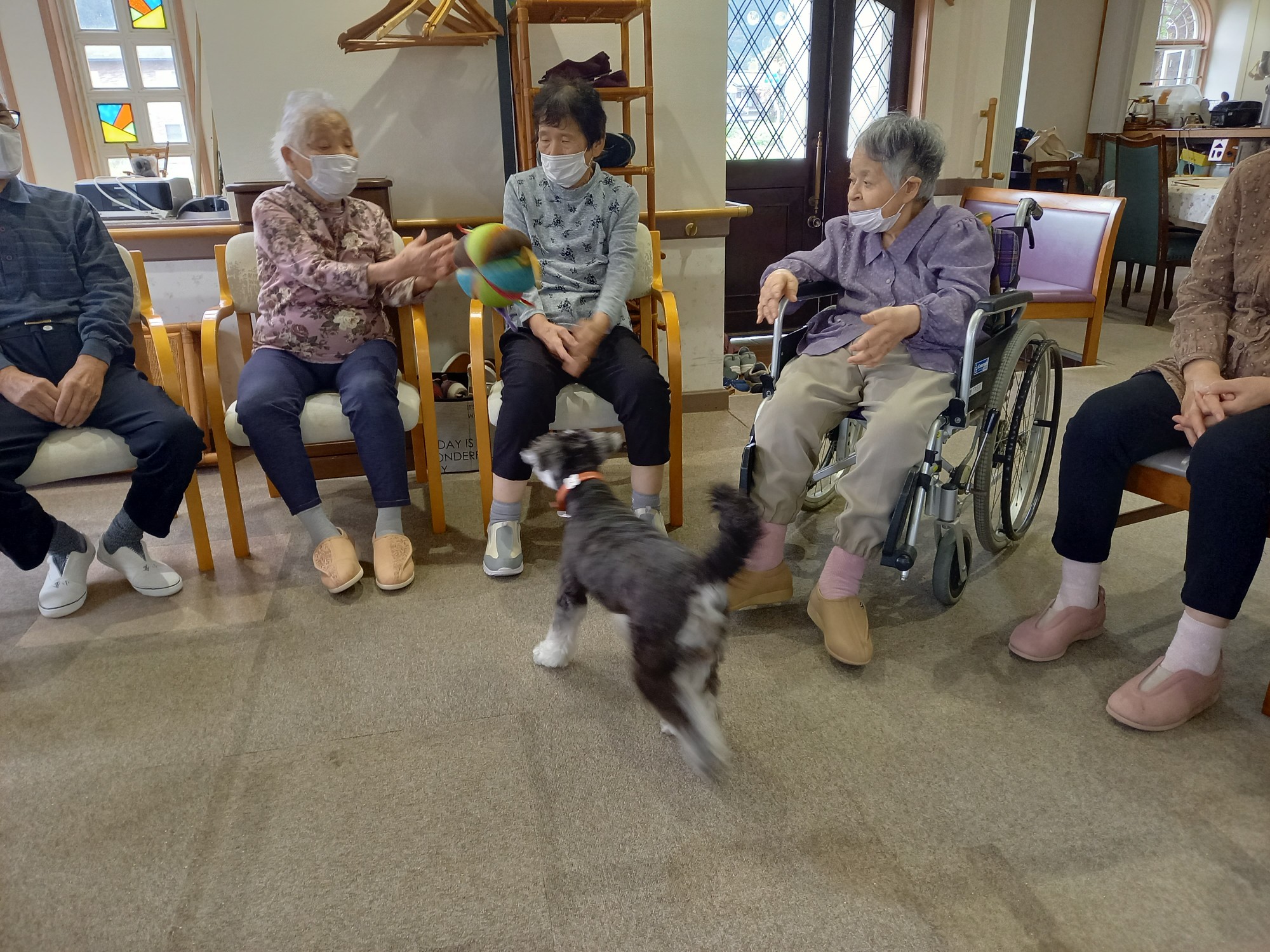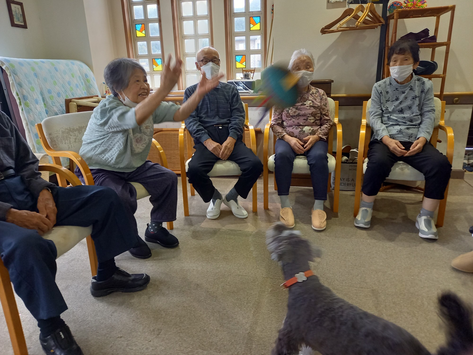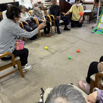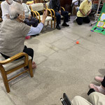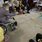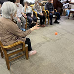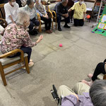 皆さんは円陣に座って頂いていますが、このボールは投げにくいのか、なかなか思うところに届きません。皆さんのミスはバムのチャンス、素早くボールを取りに行きます。