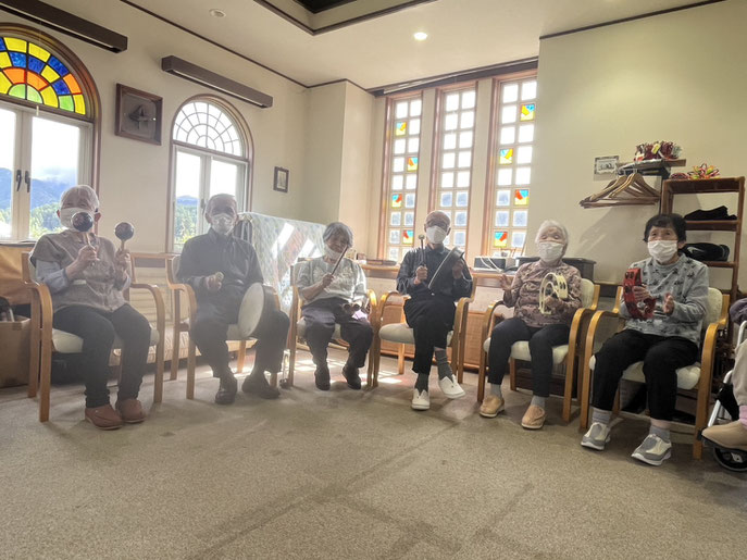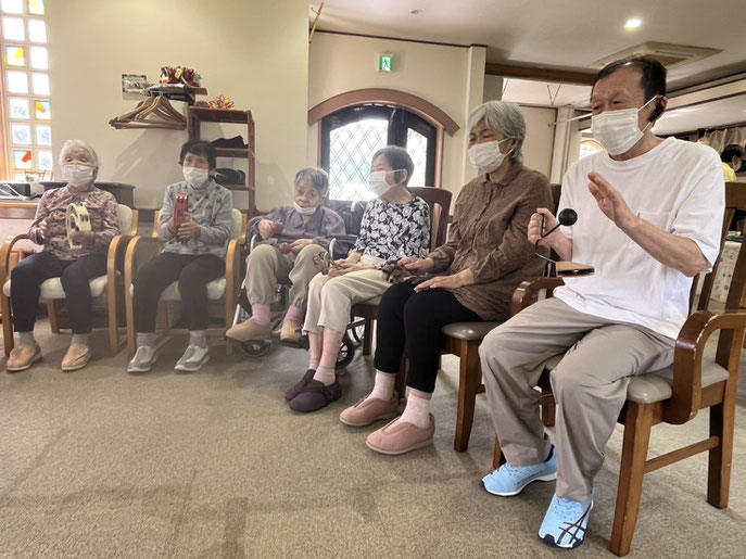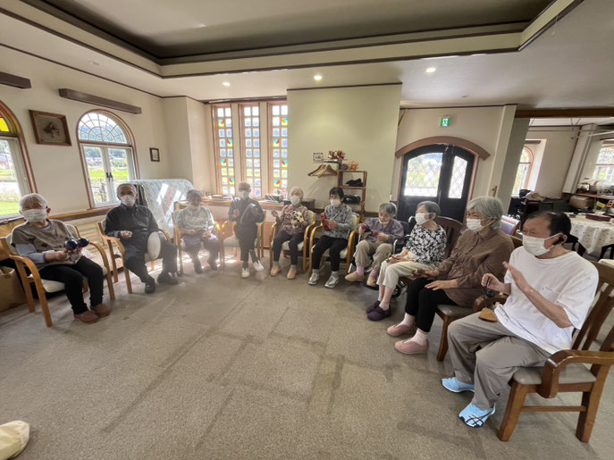 この後も楽しい愉快な歌を歌ったり、心情溢れる歌を歌ったりして体と心の活性化に取り組んで頂きました。